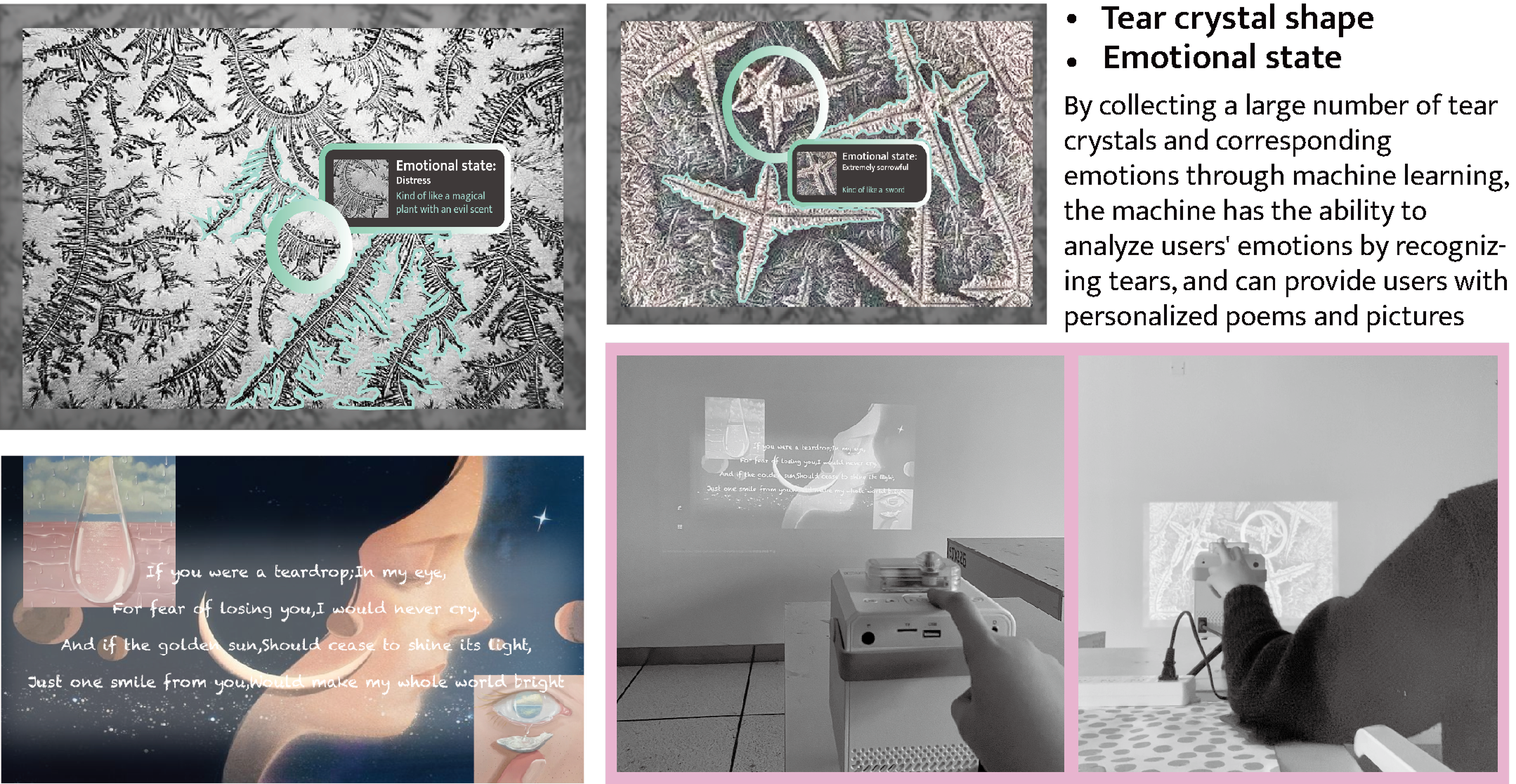 In our busy lives, we often find it difficult to release our inner emotions because of social pressure and emotional distress. There are a group of people who are not used to crying, who bury their feelings deeply, but want to understand their own heart. To help these people, I designed Reflections of Tears, a project that opens a new window on emotional expression through a combination of technology and art.