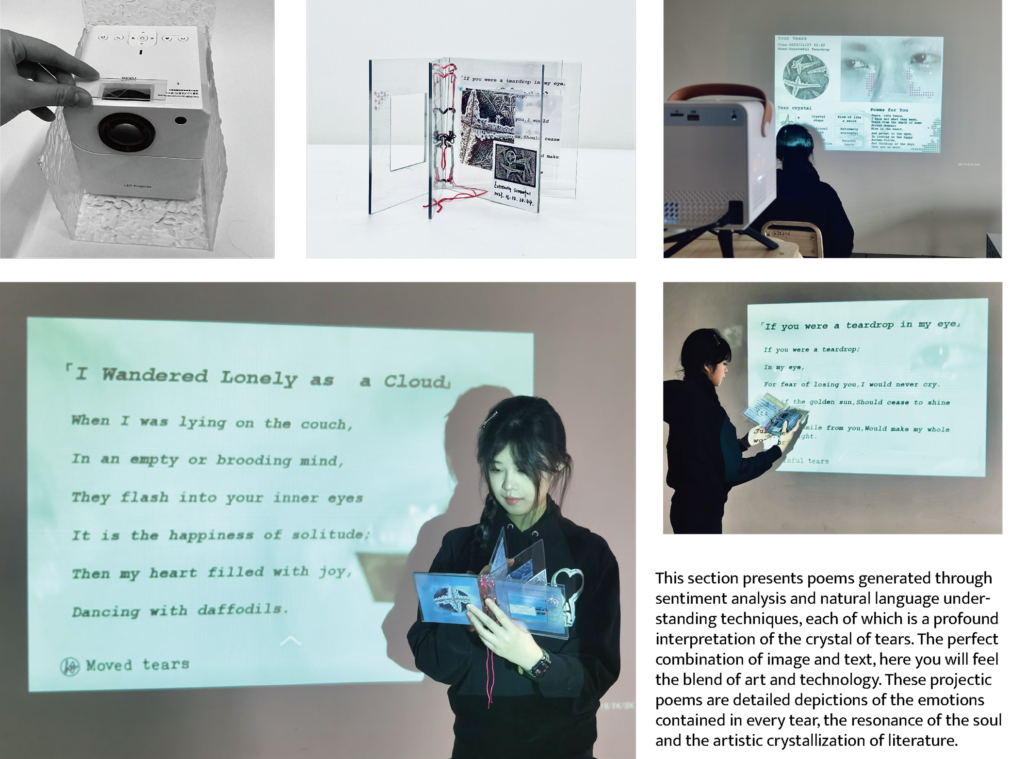 The projection in "Crystal Emotions" is the visual core of the project, which presents a visual feast for users by projecting the form of tear crystals and the generated art works into a suitable display area.